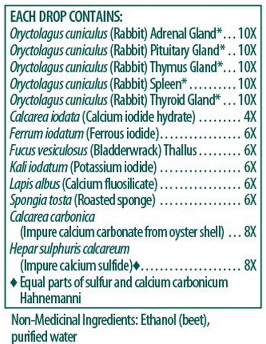 Organotherapy and homeopathic remedy • Homeopathic preparation with rabbit adrenal, pituitary, spleen, thyroid and thymus, botanicals and minerals Convenient liquid format • Increases patient compliance